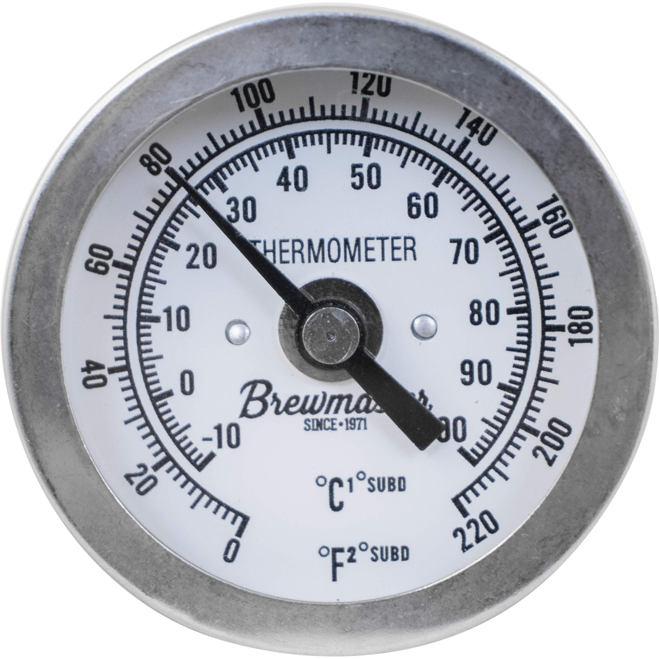 With 1/2" MPT threads, the Brewmaster dial thermometer is ready to be easily installed on most kettles, mash tuns, and hot liquor tanks. More low profile than it's bigger brother, this unit has a 2" face and 1.875" probe. Measures from 0–220°F. Made from 304 stainless steel.