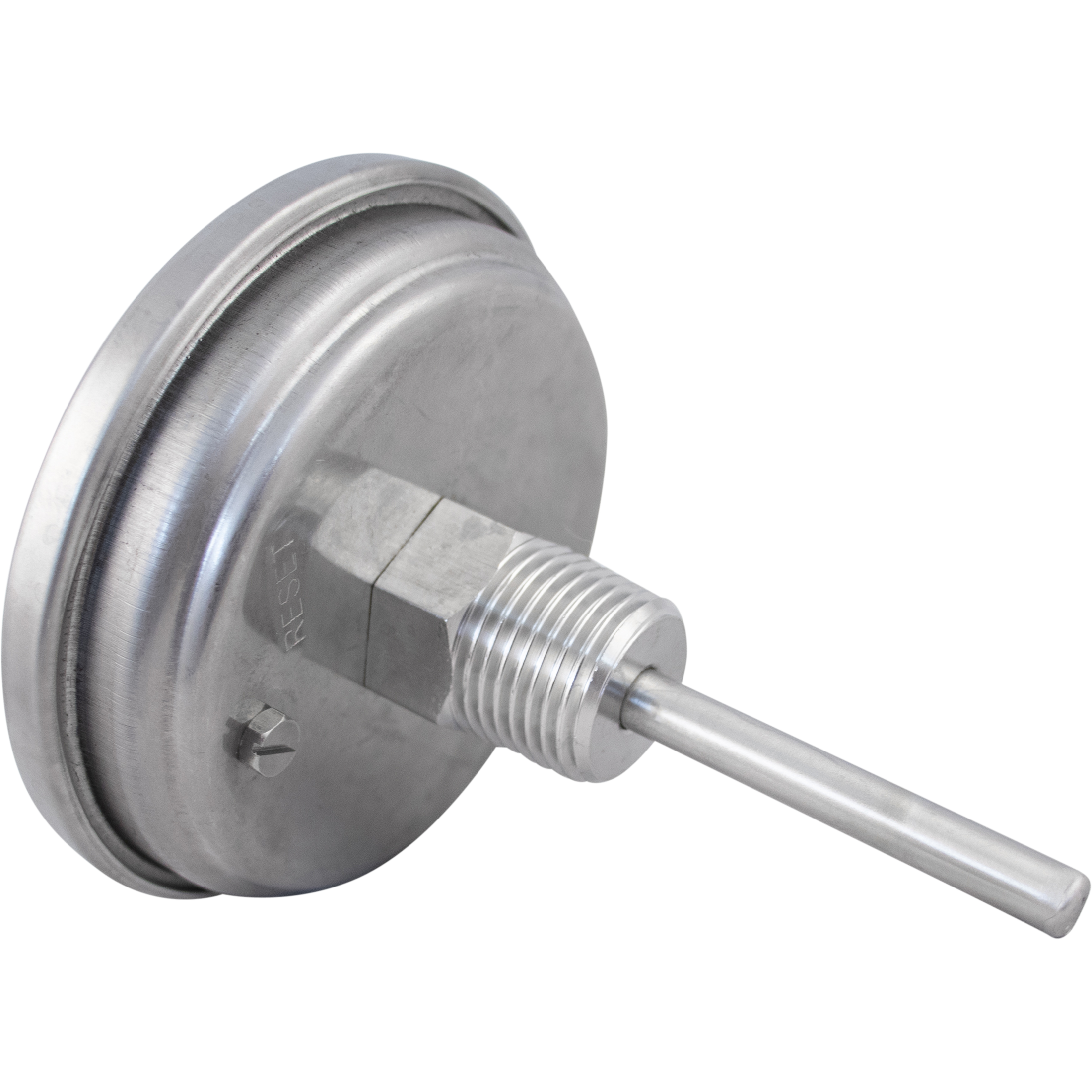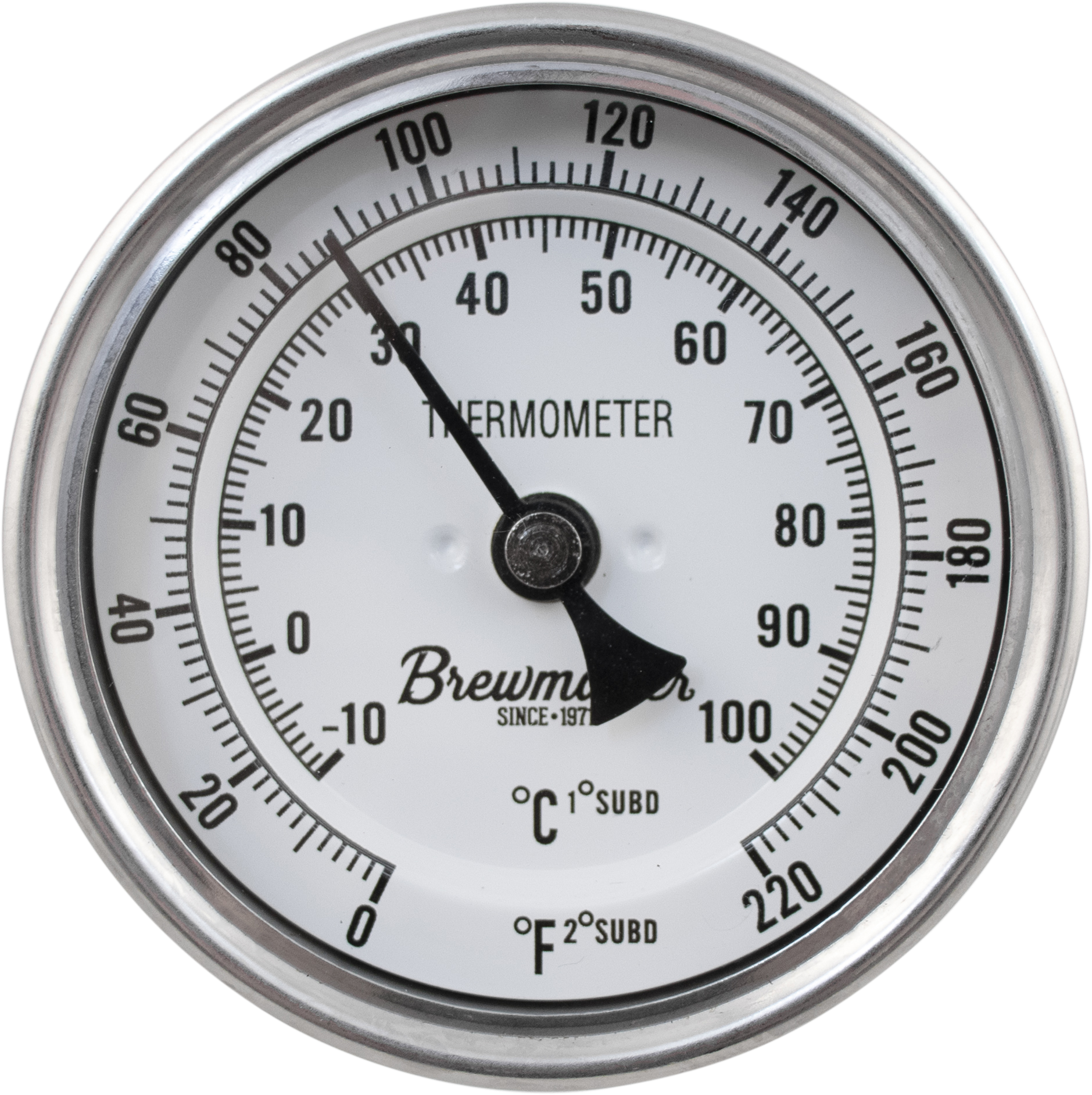 With 1/2" MPT threads, the Brewmaster dial thermometer is ready to be easily installed on most kettles, mash tuns, and hot liquor tanks. The 2" probe takes accurate readings while staying out of the way. Large 3" face is easy to read. Measures from 0–220°F. Made from 304 stainless steel.