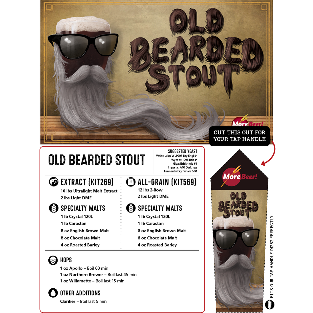 This imperial stout is one of our most complex recipe kits. Not only because of the ingredients invovled (2 types of extract, 5 specialty malts, and 3 different hops!), but because of the mouthfeel, flavors, and aromas it provides. This is also one of those beers that continues to improve the longer it's allowed to age. Our Old Bearded Stout is bold, boasting an incredible roasty, bready flavors, and aromas of chocolate and coffee. Coming in at right around 8.9%, this is a great beer to "just have one" of, but we won't blame you if you go for a second!
