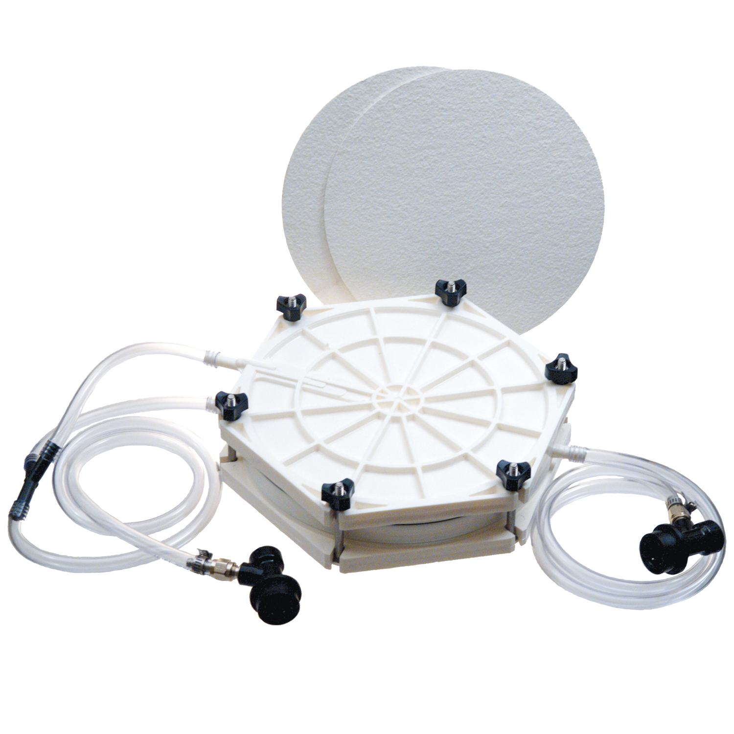 Most breweries and wineries use a large plate filter system to achieve clear product. Now you can do the same at home with two corny kegs. Our Beer and Wine Plate Filter Kit has a larger surface area, which means more yeast and particulate extraction than our cartridge filter, and comes with our plate filter, two disposable filter pads, tubing, flare fittings, and two flare beverage ball locks. This kit works great as either a beer or wine filter, but you may want to use different pads depending on the results you're hoping to achieve