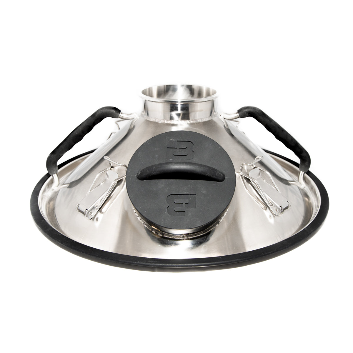 Brewtools pro steam hats are designed for maximum flexibility. They feature a silicone edge seal, 4 clamps to hold it in place on your brewing system, a 110mm inspection hole you can add your hops through when boiling, 2 silicone covered handles and a 4 inch accessory mount on top. The silicone plug for the inspection hole is included.