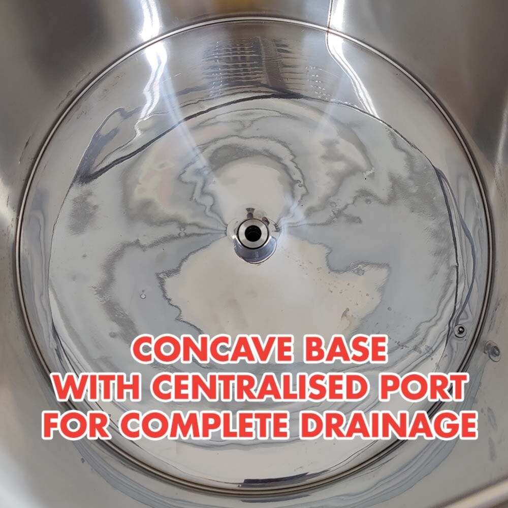 Mirror polished dome shaped bottom with center drain — get every last bit of wort into your fermenter while the perforated bottom screen filters out 95% of hot break and hop matter