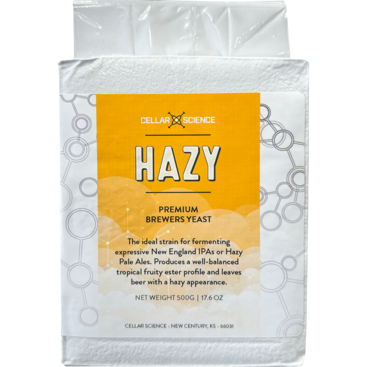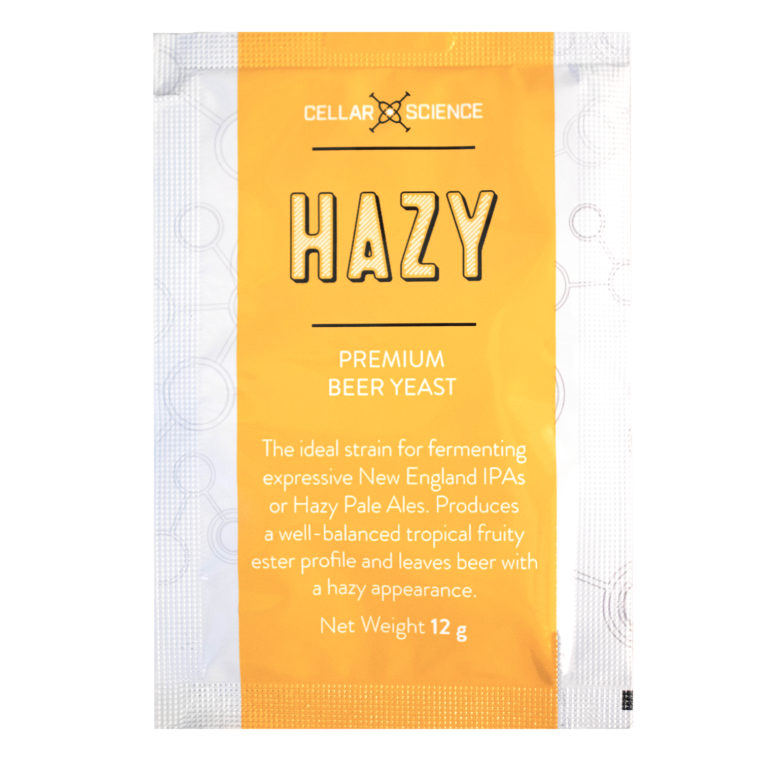 For hop-forward beer styles that you want bursting with tropical, fruity flavors and aromas, you can't go wrong fermenting with HAZY from CellarScience. HAZY will enhance the fruit-forward 'juicy' character of your hops while contributing its own ester profile with notes of peach, citrus, mango and passionfruit. It will be more expressive the higher in its temperature range you let it go, leaving your beer with a hazy appearance when its finished. This is the ideal strain for fermenting expressive New England IPAs or Hazy Pale Ales.