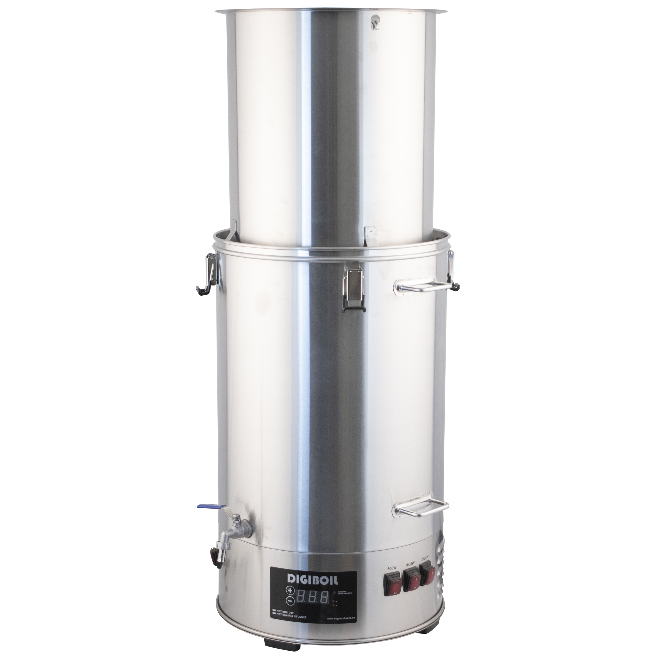 This model comes with the 65L DigiBoil, which has three built-in heating elements that run off a 220V plug. The elements are 2000w, 1000w and 500w for a combined 3500 watts! The elements can be individually controlled, allowing you to use a single element to gently hold temperatures, or engage all three elements to quickly go from steeping temp to boiling. Temperatures are set and automatically maintained through the digital control panel. Simply set your desired temperature and flip on the heating element(s).