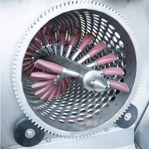 The destemming chamber is made with a gentle anti-tear design to reduce grape skin abrasion. The holes in the basket are deep punched through thicker stainless steel, from the inside out, and then bead blasted to remove any sharp edges. The destemming bar features fingers with adjustable rubber tips to ensure a gentle touch on your grapes. The destemming chamber and the destemming bar move in opposite or "reverse" direction for best performance.