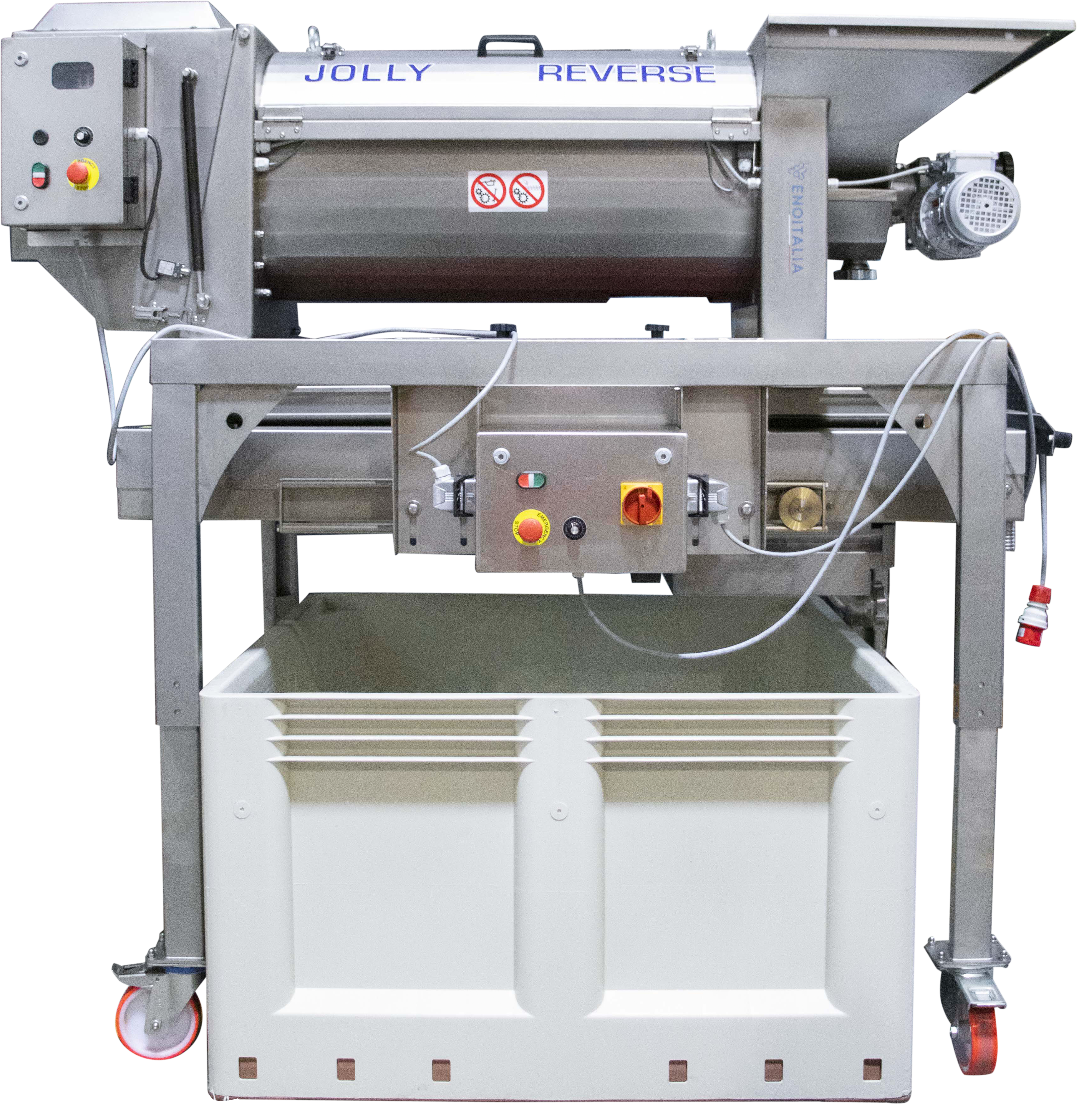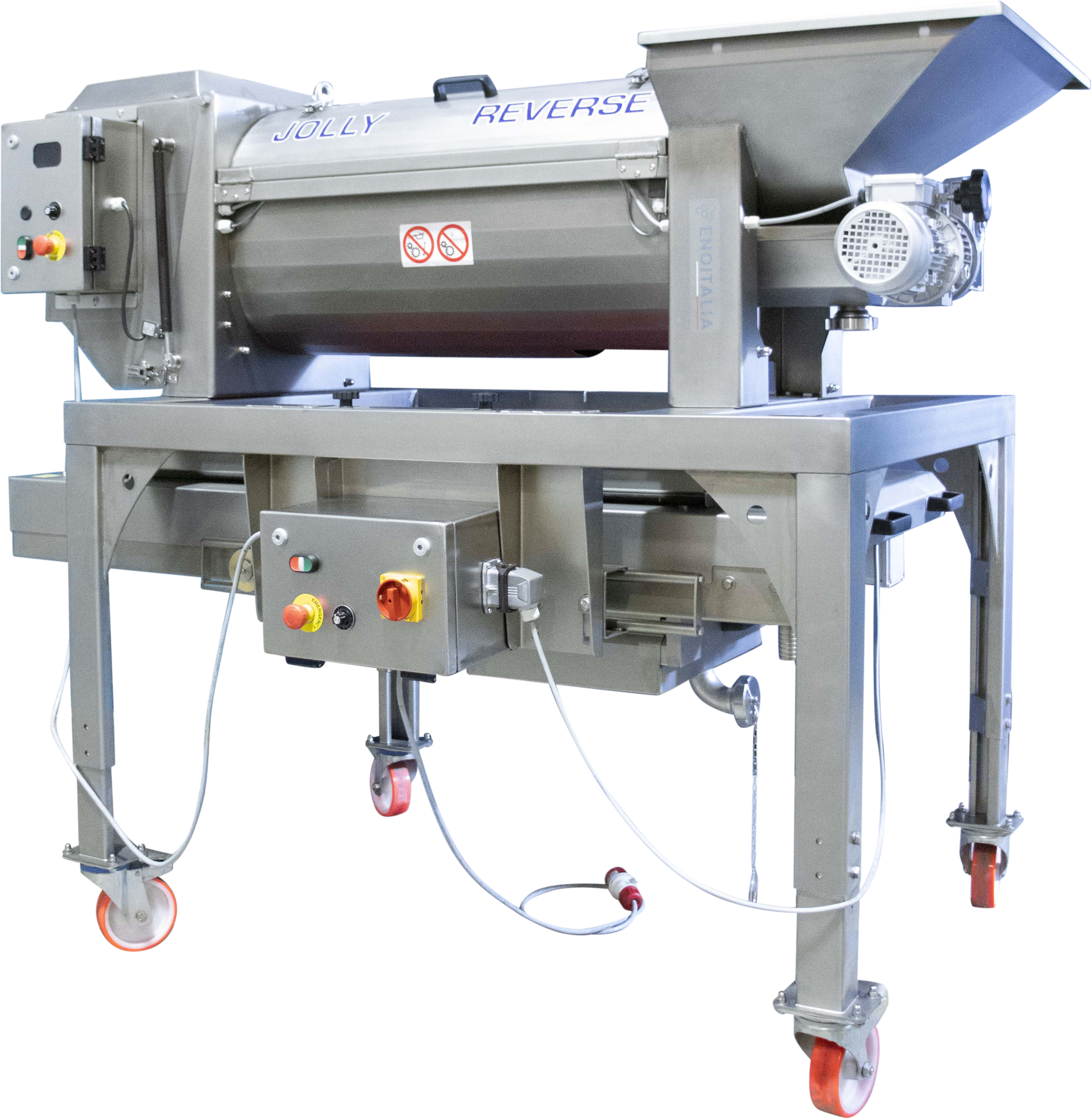 Enoitalia's newest destemmer, the Jolly 60 is the ideal processing unit for smaller wineries looking for top-quality processing at an affordable price. The loading hopper features a mechanical speed variable motor so you can control the flow of grape bunches into the destemming chamber. The destemming bar and basket are separately controlled by a variable frequency drive that allows you to turn a dial to set the right speed. Separate control of these processes allows you to find the balance between speed and quality and helps the machine from being overloaded at either stage.