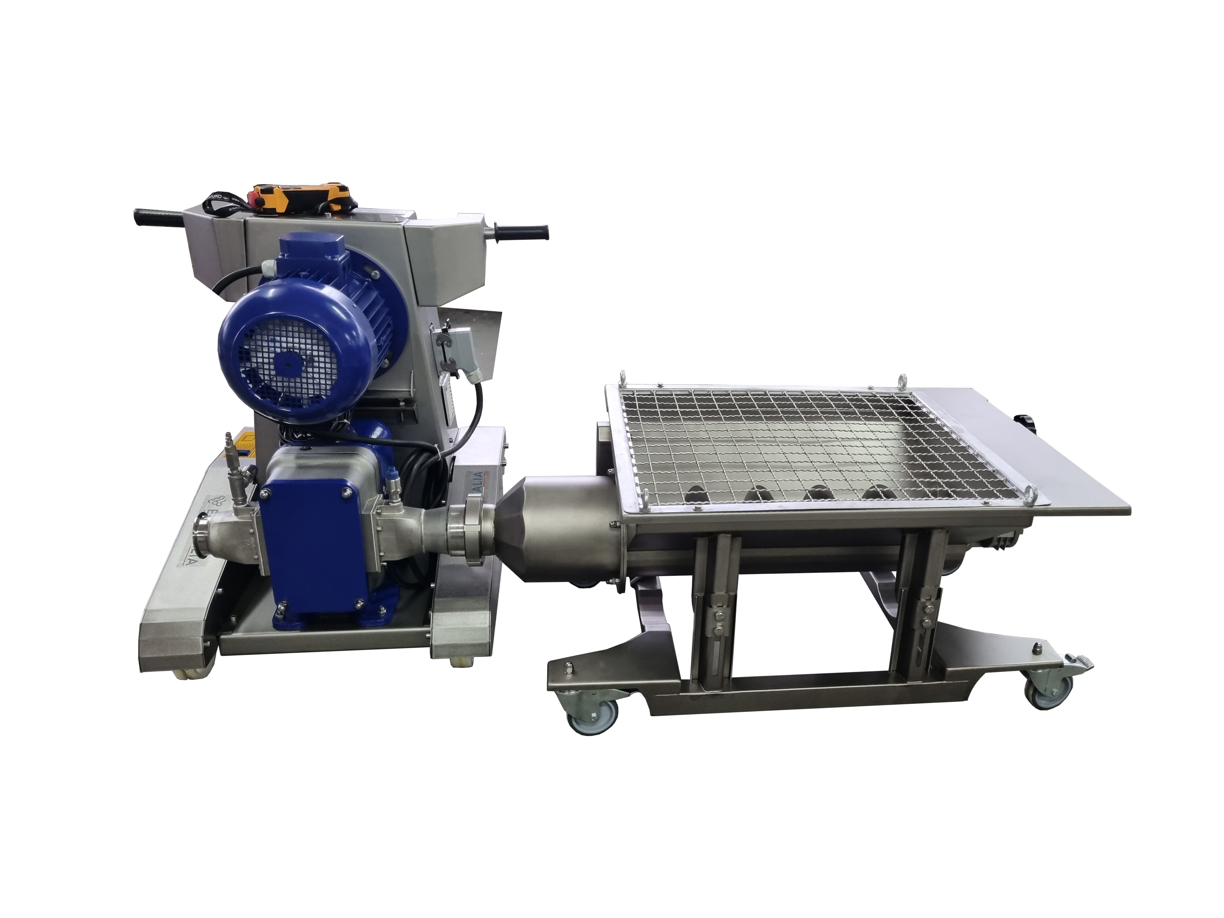 Speed control Timed and programmable volume pumping Dry stop protection - pump turns off to protect pump when dry Direction reversal Pressure switch Connection for a motorized collection buffer Wireless remote control Easy to use PLC programmable controls Low profile and easily moved Max Pressure: 58 PSI (4 BAR) 3" tri-clamp inlet/outlet 3" DIN connector for hopper included 220v 60hz 3 Phase 7.5 kW Optional receiving hopper: 220v 3 Phase 0.75 kW VIDEO