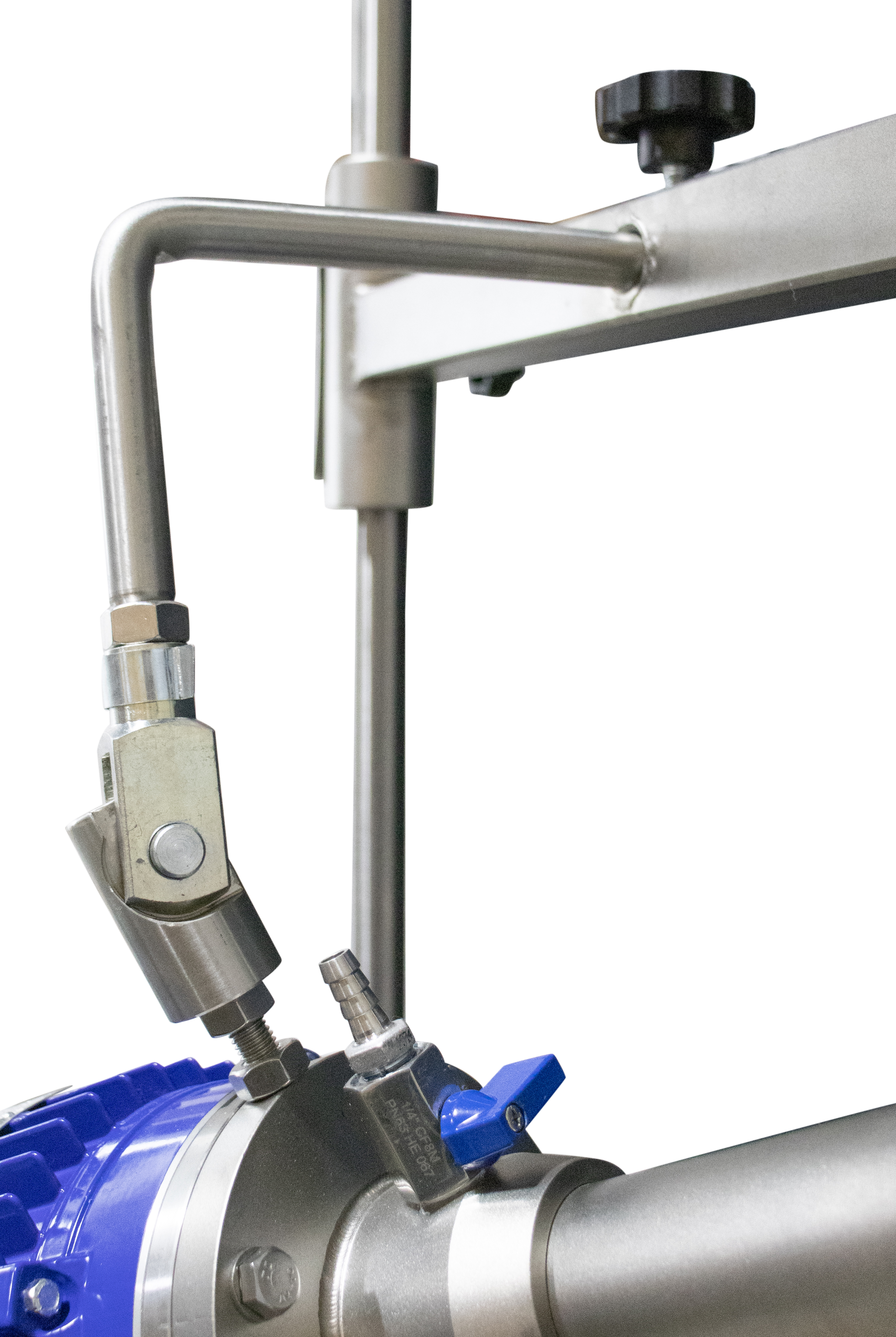 Mixing ports enter through full port 2" TC ball valves to allow for an easily installation and disassembly. Position and attach the mixer to your 2" TC ball valve. Open the valve and slide in the adjustable mixing shaft, lock the shaft in position, and turn on. Adjust the speed to accomodate your desired level of agitation. To remove unlock shaft, slide out, turn off TC ball valve, and then disconnect mixer from TC ball valve.