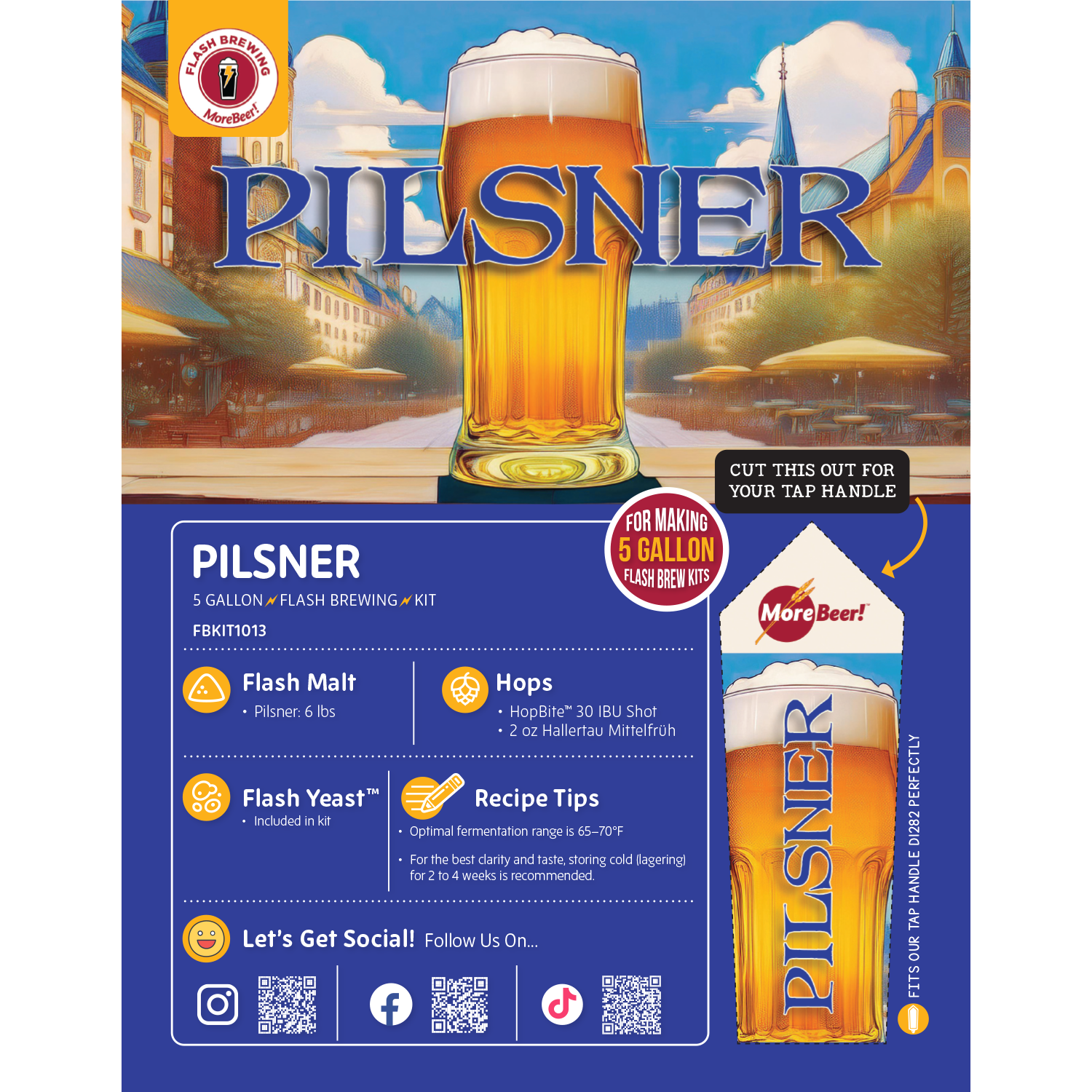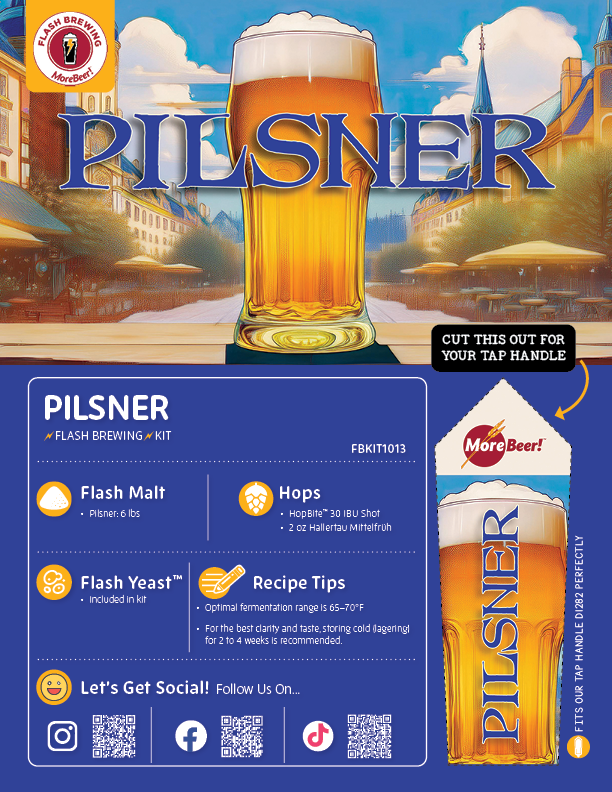 The Flash Pilsner is an homage to the classic Pilsner style, with a white, frothy head that laces beautifully on the glass. Its malt blend delivers a smooth malt profile with a subtle sweetness that balances perfectly with the crisp, clean finish. Hallertau Mittelfrüh hops contribute delicate floral and spicy aromas, while Flash Yeast™ ensures a clean fermentation. With Flash Yeast doing the work, this Pilsner can be fermented at a wide temperature range of 65°F to 85°F. For the best clarity and smoothness, lagering is recommended at 40°F. Fermenting at around 70°F, this recipe finishes fermentation more quickly than a standard lager. This easy-drinking, refreshing beer can be ready to enjoy in just a few days. For the best clarity and smoothness, storing cold (lagering) for a couple weeks is recommended.