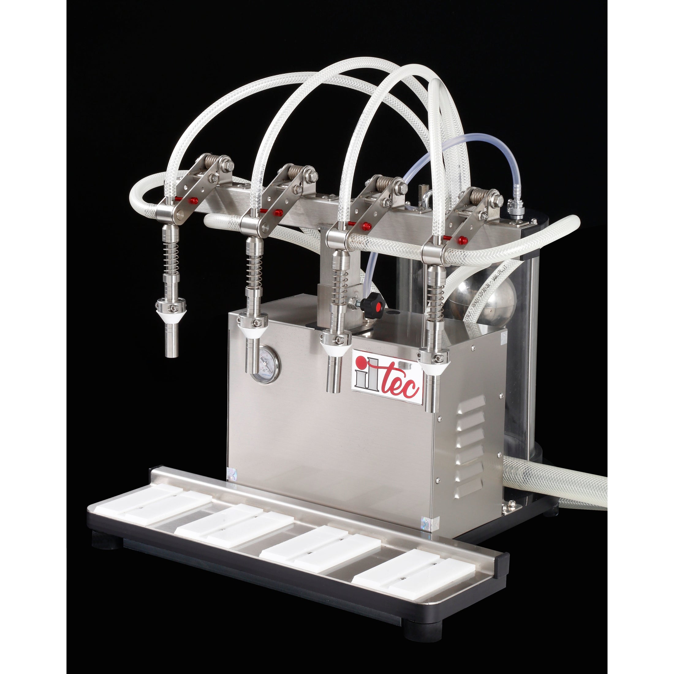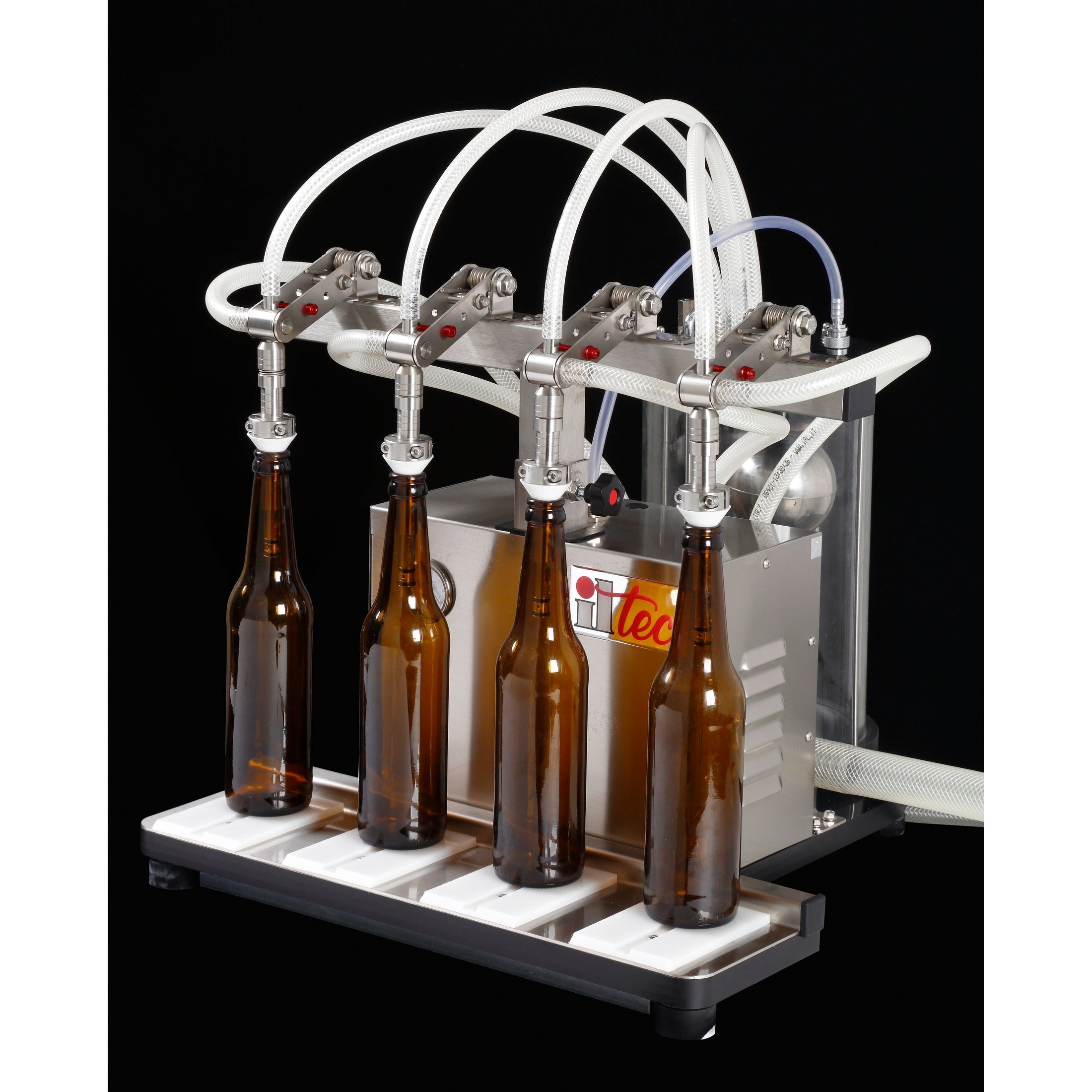 The Ultrafiller 4 is built entirely in stainless steel with PYREX tank, featuring four high efficiency and precision stainless steel filling nozzles. This professional bottling machine is perfect for wine, uncarbonated beer or cider, spirits, and oils. When you place the bottle under the Ultrafiller 4, the fluid is sucked into the vacuum created inside it, without any contact between the liquid and the pumps or mechanical components.