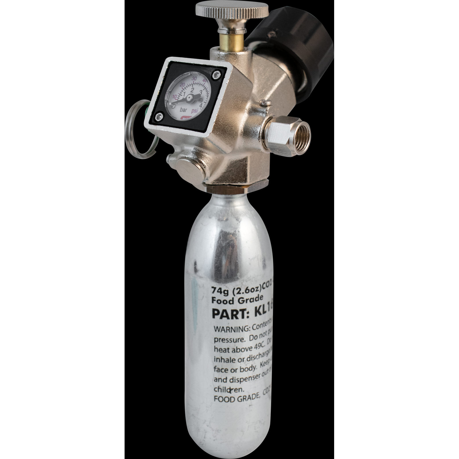 Furthermore, the Core 360 Mini Regulator is designed to be compatible with both 16g and 74g cartridges. Out of the box it will be ready to accept 16-gram 3/8"-24 UNF threaded cartridges. But with a simple adapter you can switch to 74-gram 5/8"-18 UNF threaded cartridges.