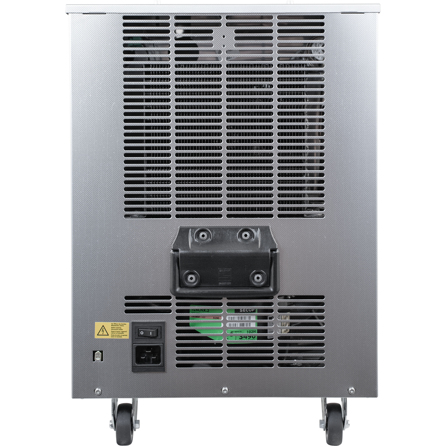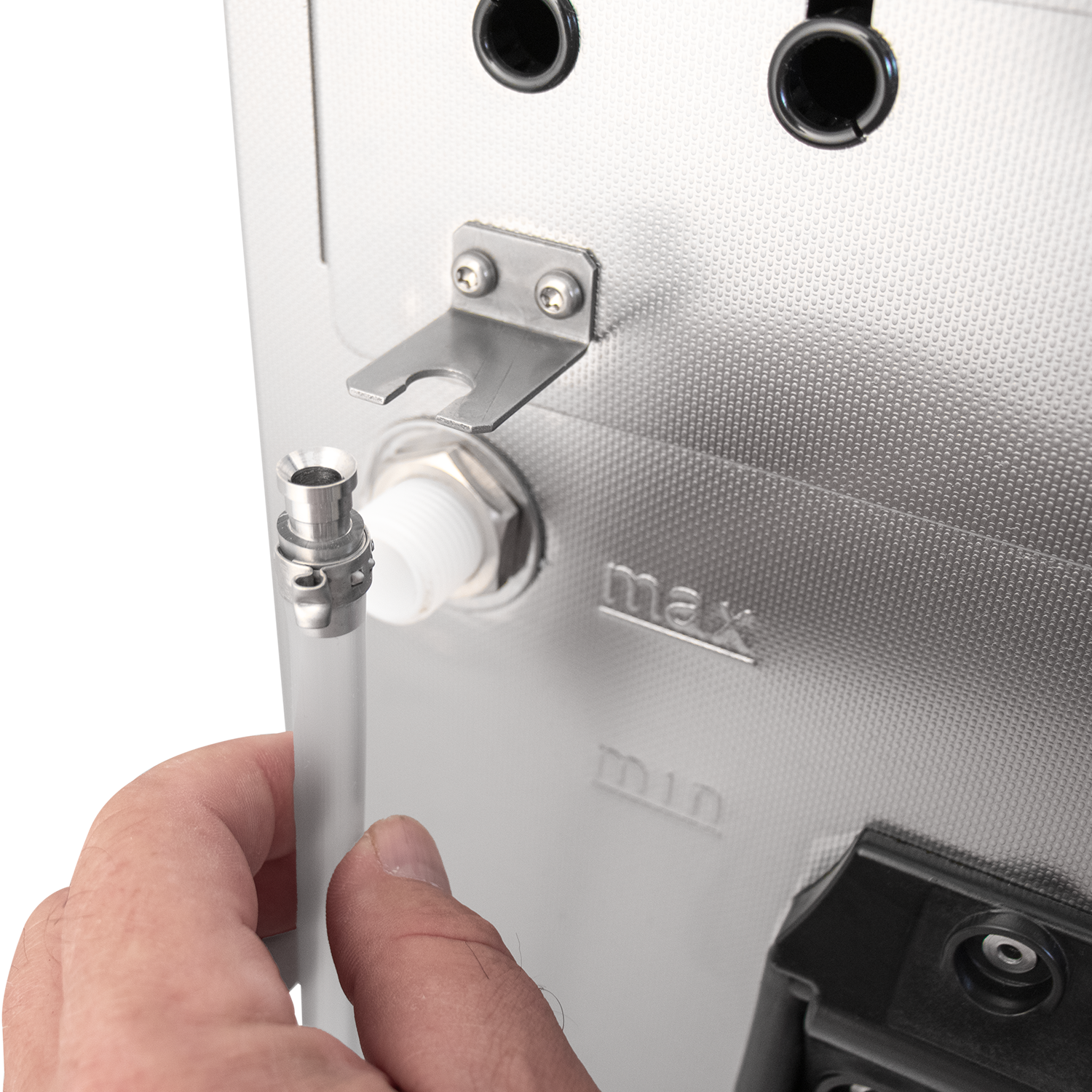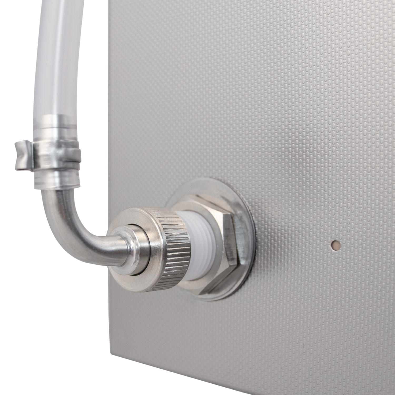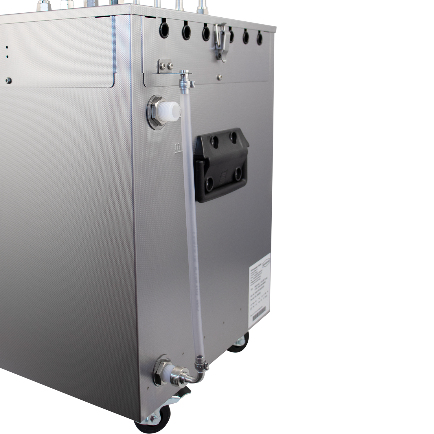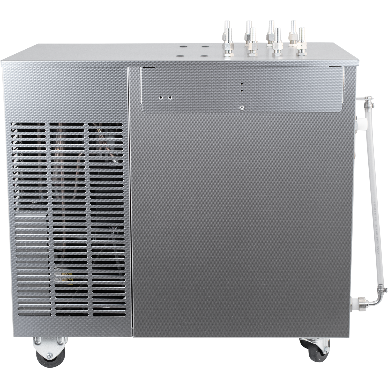 The unit features a stainless steel case with stainless 3/8" barbs in the top that allow for a clean connection of the silicone tubing that will run from each pump to each tank. The MiniChilly is able to chill its reservoir down to 21°F when a 30% glycol solution is used. The compact size and included casters make it easy to move around the brewery when needed.