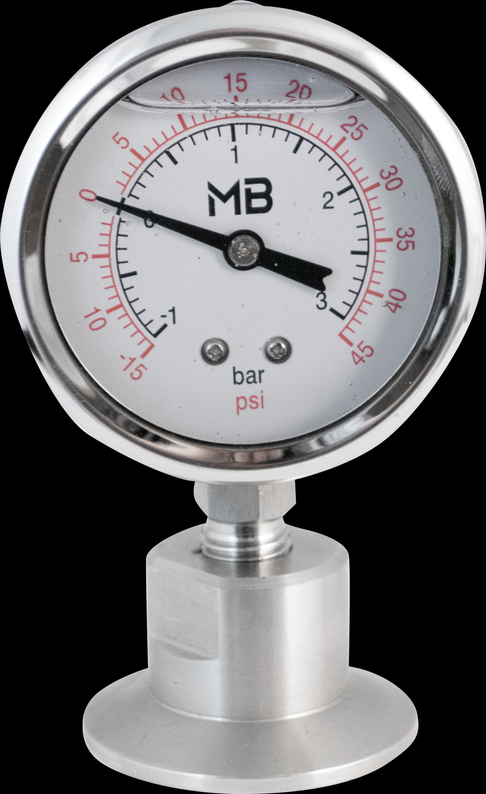 Tri-clamp oil filled pressure/vacuum gauge. Reads from -15-45 psi and -1-3 bar. Direct replacement part for MB Conical Fermenters and Brite Tanks.