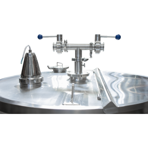 The mash tun has a slotted plate screen with a large grain out port on the side. The optional hydrator allows you to mix grain with hot liquor if you have your mill or grist case above the mash tun. There is a large top access for manual stirring. The walls of the mash tun are insulated to provide stable mashing temperatures. While intended for a single infusion mash, step mashing can be performed by recirculating through a heat exchanger. The sparge arm is adjustable in height and it is intended to have an inch of water above the grain and have the bottom of the diverted plate resting on top of the grain for low oxygen pickup during recirculating and sparging. We recommend that you use a grant to avoid creating suction on the bottom of the mash screen. It is possible to pull 23,000 lbs of force on the screen with a pump and a fully stuck mash and even partial vacuums can produce significant force. Alternatively, you can install a vacuum breaker ahead of the pump. Replacement screens are available for special order.