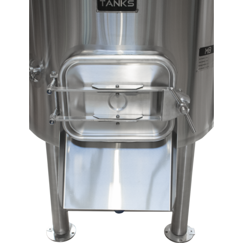 Slotted 3-piece false bottom, adjustable height sparge arm, and large grain out manway door with removable chute
