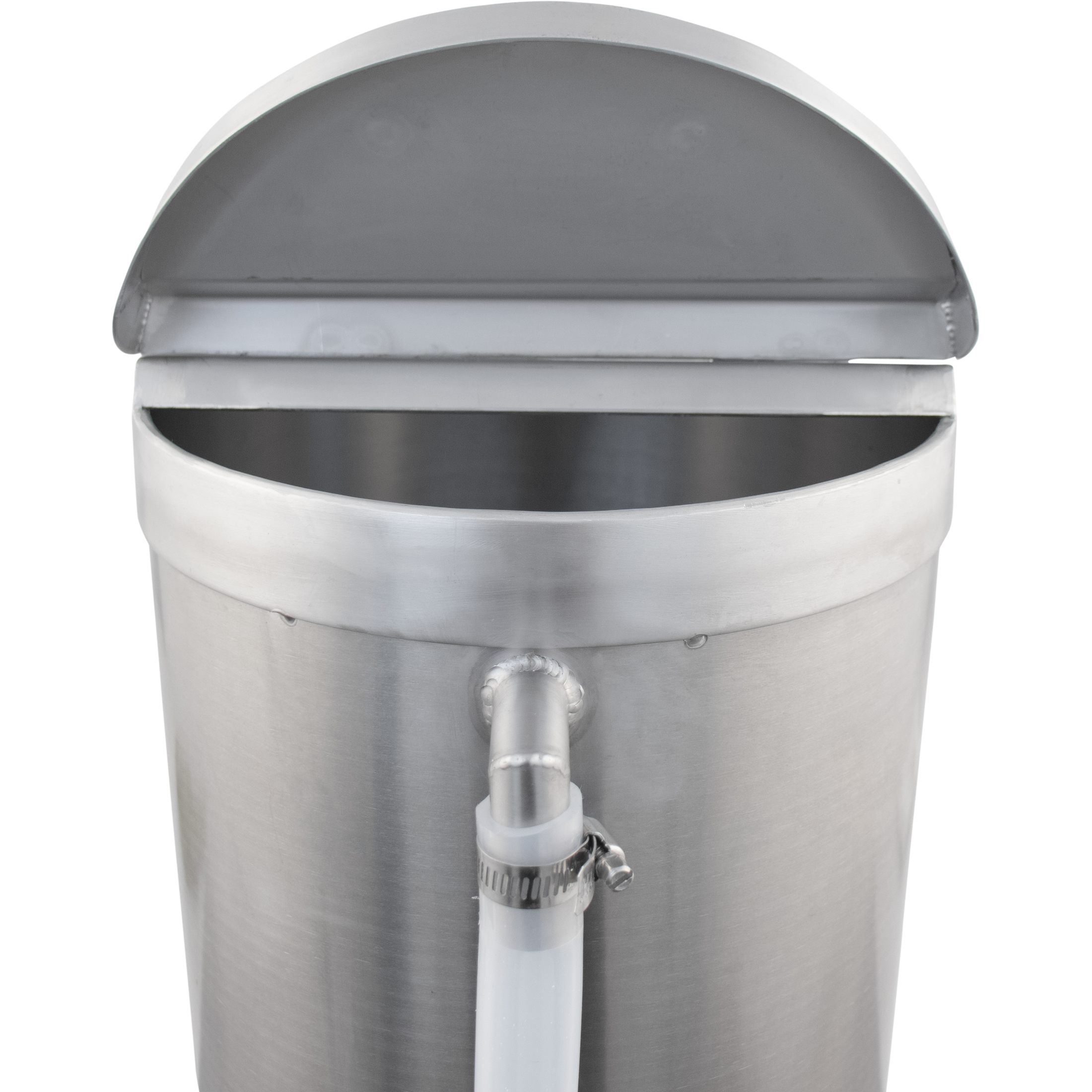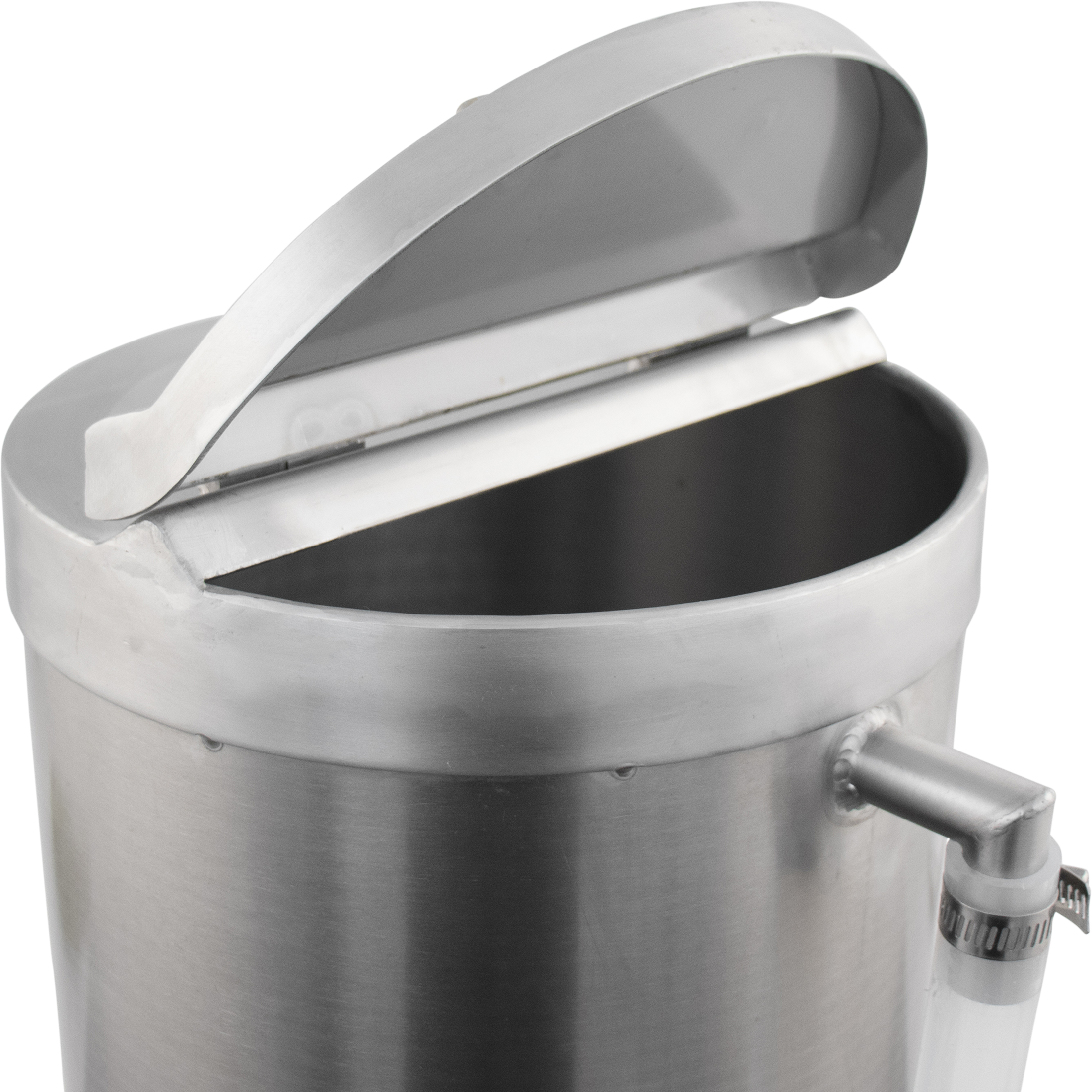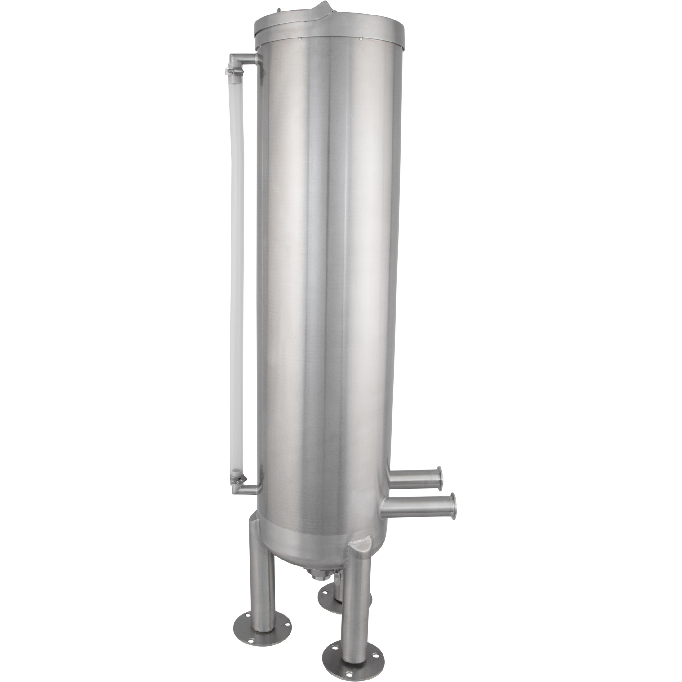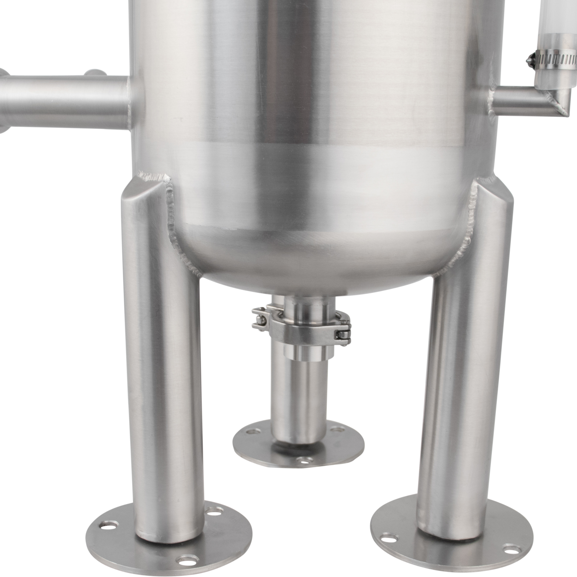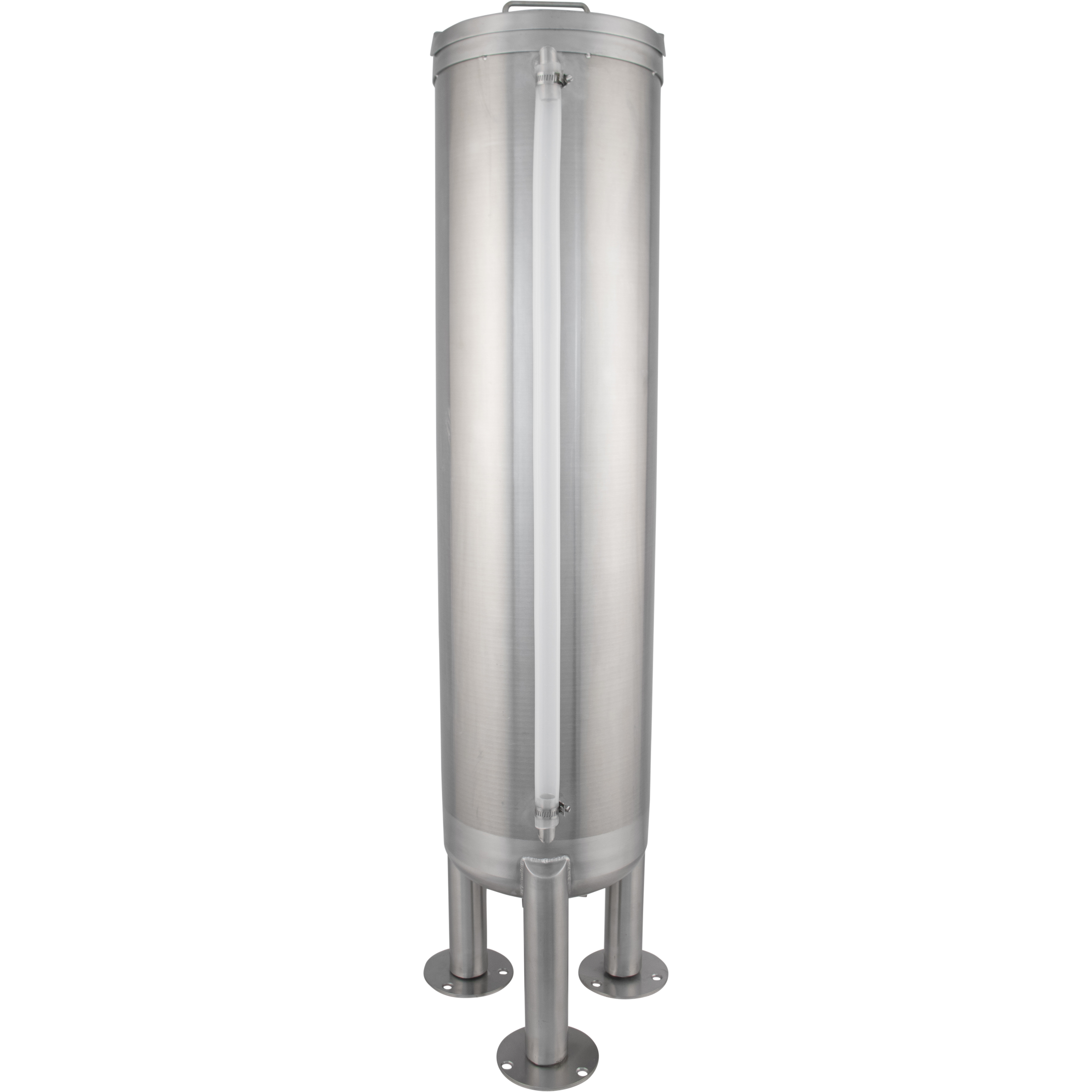 This tall cylindrical grant has three 1.5" tri-clamp ports and a silicone tube for a sight glass. The narrow design helps to reduce surface area and hot side aeration. The inlet and outlet side ports are raised a few inches above the conical dish bottom dump, which helps to separate grain sediment from the wort.