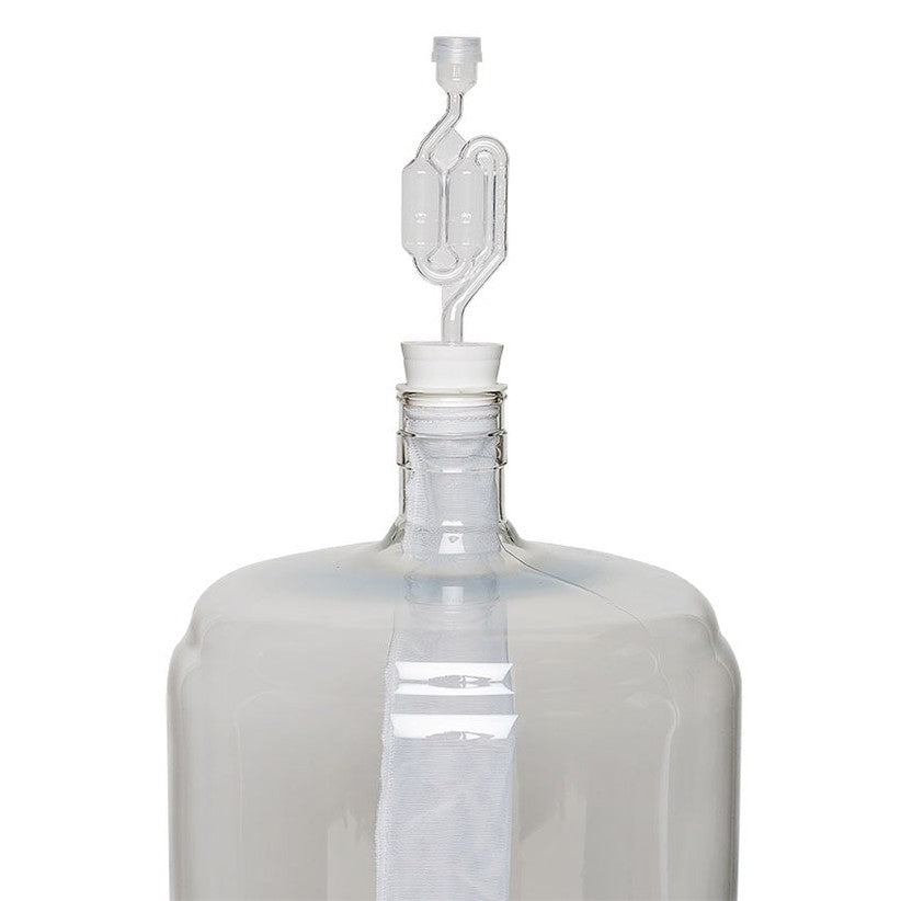 This mesh sleeve is custom made for the Vintage Shop PET Carboy. The plastic ring sits inside the neck of the fermenter with room for a #10 stopper to be inserted for an airtight seal. The ring actually holds onto the neck of the carboy so there's no risk of the mesh sleeve falling into the carboy.