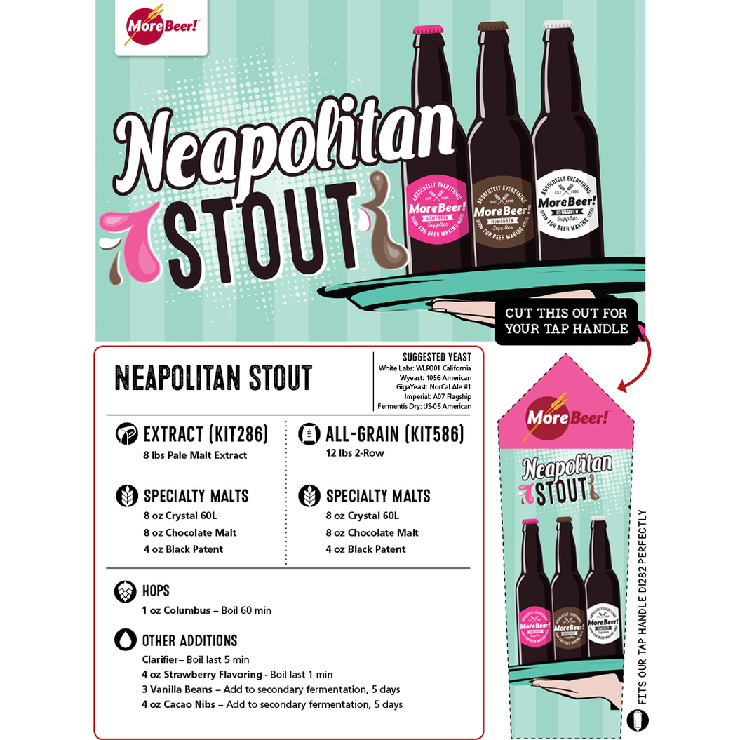 In this kit, we include 4 oz of our Tcho cacao nibs, 4 oz of our natural strawberry flavoring, and 3 vanilla beans. The result is an incredible flavor that will have you and your friends craving something new for dessert: The MoreBeer! Neapolitan Stout!