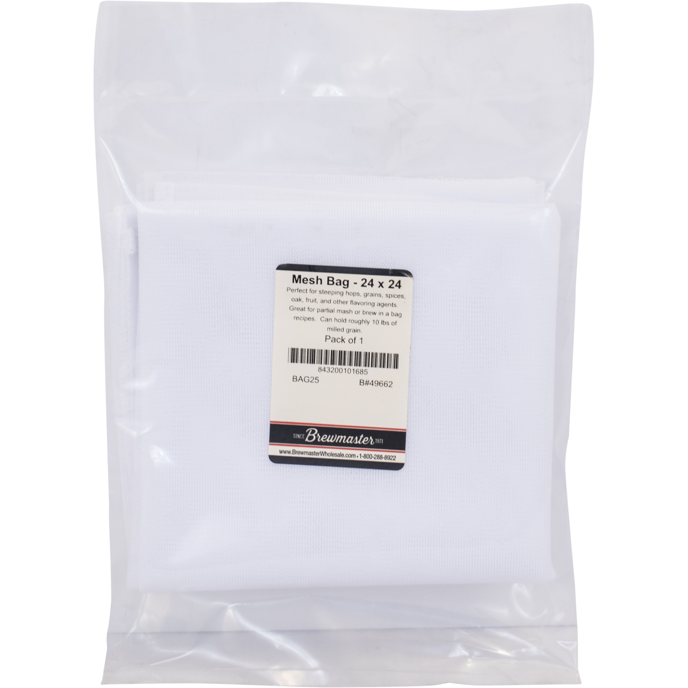 Large 24 inch x 24 inch nylon mesh bag. No drawstring. Perfect for large grain additions, fruit wines, and large amounts of hops, oak, etc. for commercial users. Packaged each in a bag with a label.