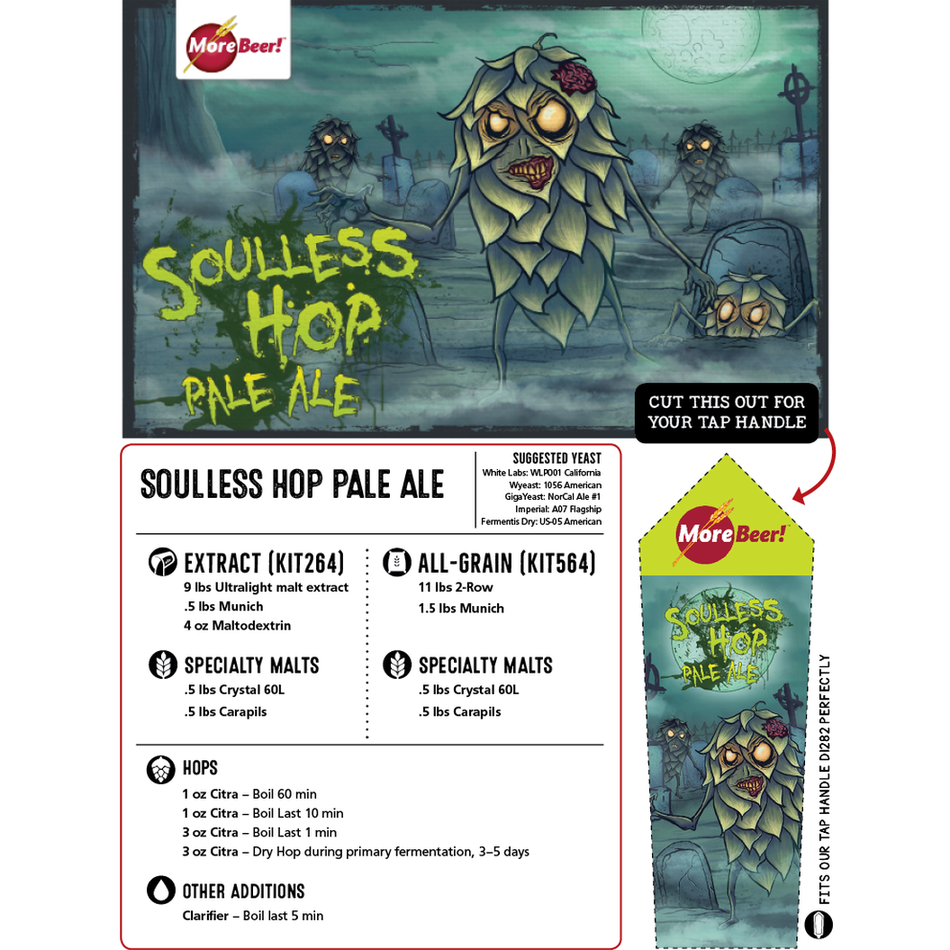 Run! The walking dead hops are here! The only thing different between Soulless Hop and actual zombies, is that you'll be running towards this beer, rather than running away! Malty with a huge Citra® hop presence, this is our clone of the nationally known and loved Zombie Dust Pale Ale by 3 Floyds Brewing Co! This recipe falls right in line with the original featuring Munich, Crystal 60L, and Carapils malts along with fresh 2-row base malt to create a smooth malt backbone with a nice mouthfeel. The only hop in this beautiful beer is Citra®, but there's a whole lot of it! With half a pound per 5-gallon batch, the Soulless Hop Pale Ale is a prime example of just how amazing Citra® hops truly are!