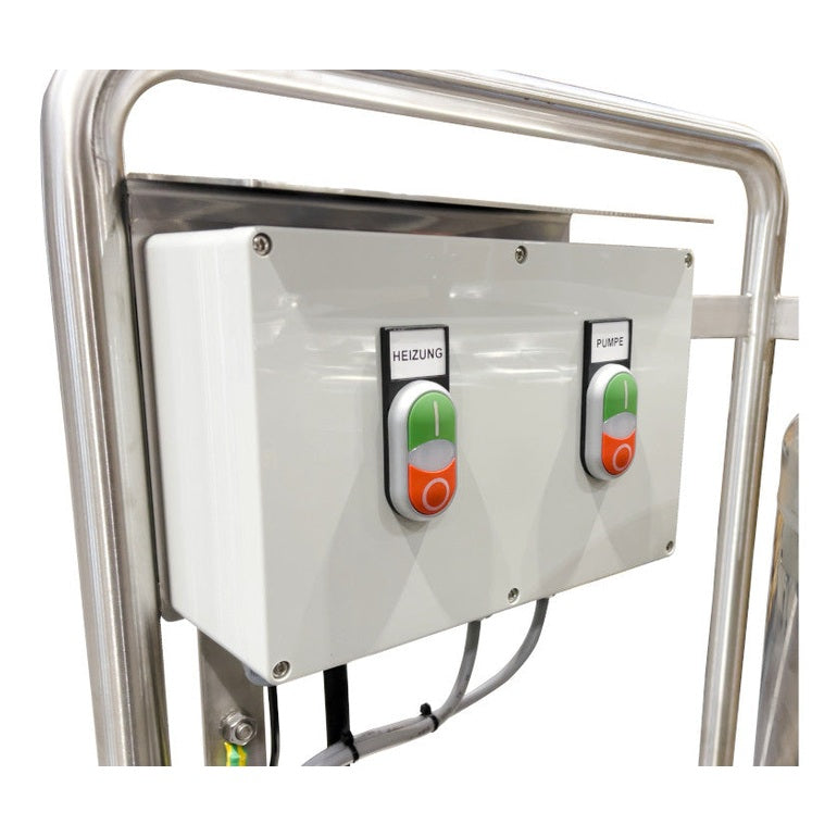 This Speidel CIP System is designed for efficient and thorough cleaning of fermenters and closed systems like plate chillers. Equipped with a temperature display and heating device for caustic, a temperature gauge for acid, and a powerful stainless steel delivery pump, this system ensures effective cleaning, acidification, and rinsing processes. The unit is compact, movable with caster wheels, and features easy connection options.