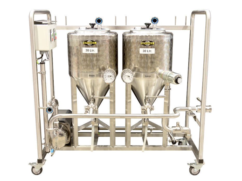 This Speidel CIP System is designed for efficient and thorough cleaning of fermenters and closed systems like plate chillers. Equipped with a temperature display and heating device for caustic, a temperature gauge for acid, and a powerful stainless steel delivery pump, this system ensures effective cleaning, acidification, and rinsing processes. The unit is compact, movable with caster wheels, and features easy connection options.