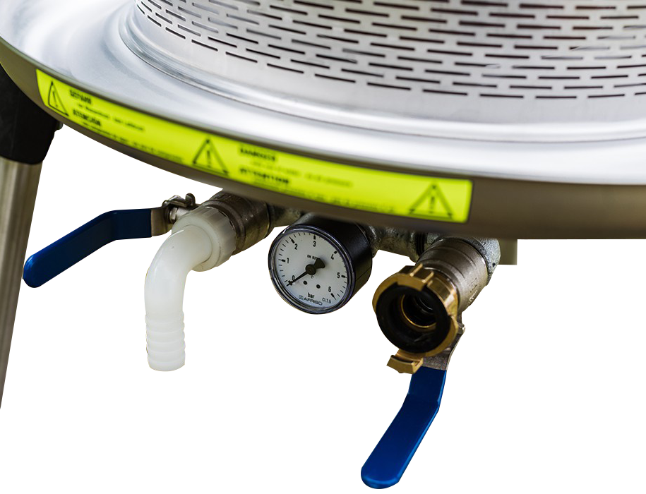 This press can be used with any domestic water supply the provides at least 2.5 bar (36 psi) of pressure. Pressing pressure and pressing time is simply regulated by the water flow. These units are extremely easy to care for and can be cleaned quickly by simply spraying it down with a hose after use. You will find the quality you'd expect from a product that is 100% German-made.