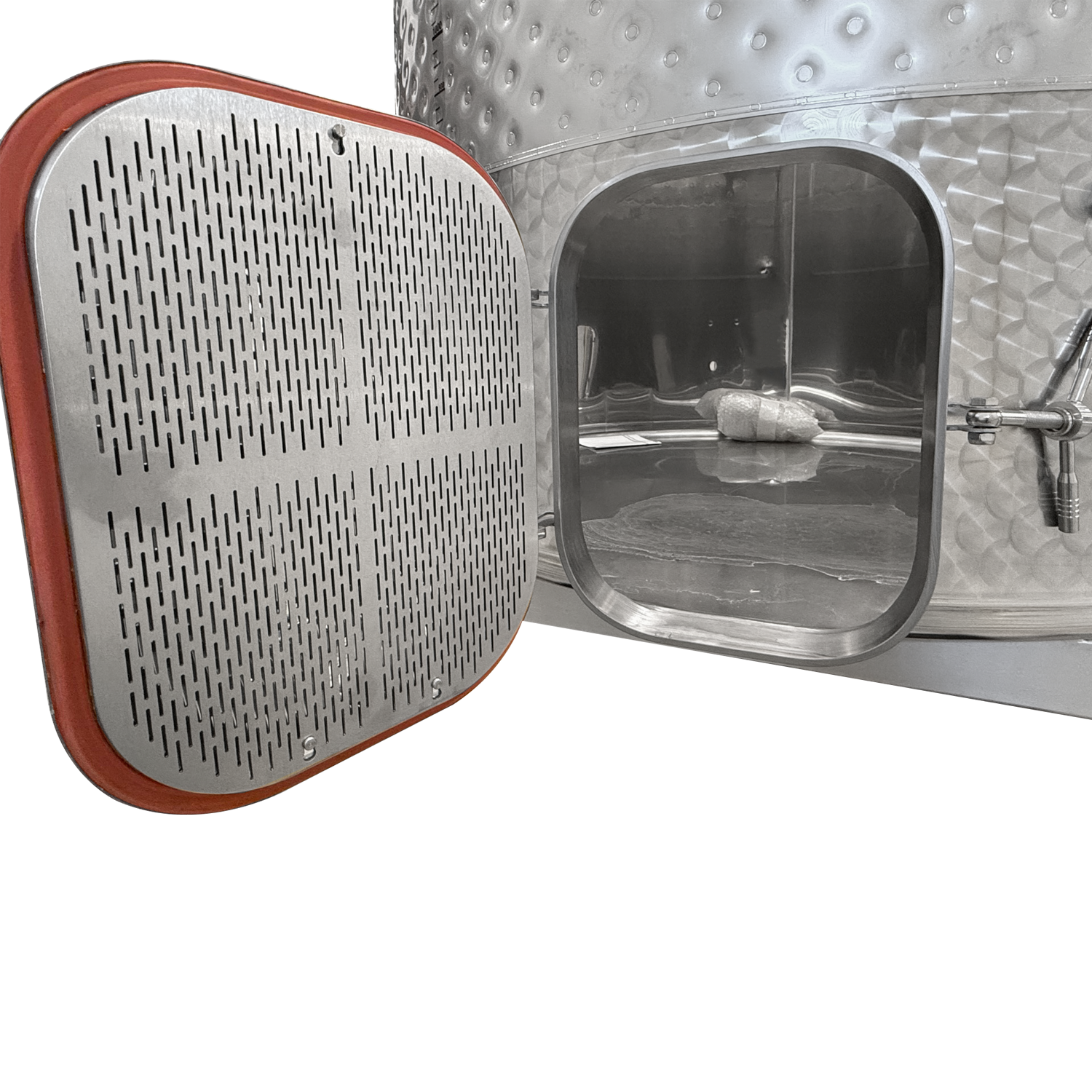The manway has a removable screen on the backside. This allows you to connect to the tri-clamp fitting welded into the manway and pump out all the free run juice before dumping in the press. Alternatively, if you are not going to tip the tank, the manway is still handy for easily removing skins. The internal perforated screen is discretely mounted on the inside of the manway, allowing it to be out of the way during punch downs. When you swing the door open after the tank is empty, the screen is easily removed for cleaning.