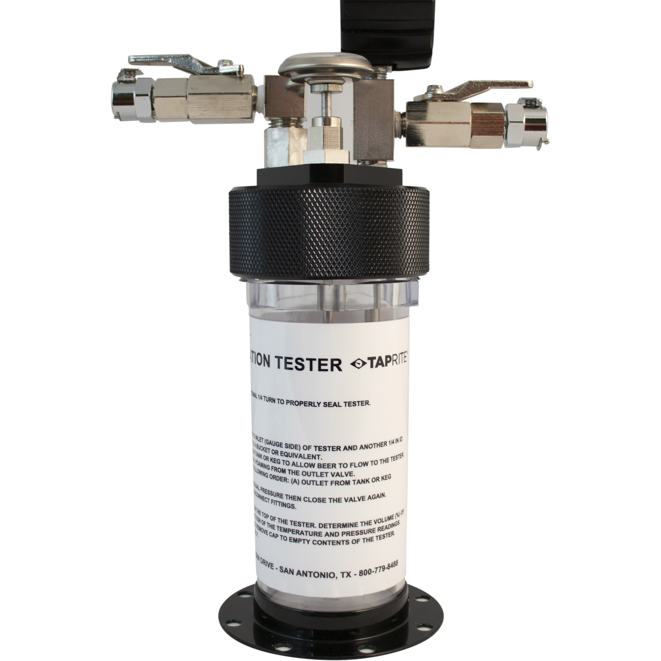 The Taprite beer carbonation tester is designed to be used in the field to verify carbonation levels during equipment installation and keg change-outs. It is a cost effective and accurate tool for troubleshooting and quality control. The carbonation tester's sturdy, 11-ounce acrylic canister includes a handy label noting the appropriate CO2 volume based on your temperature and pressure reading. The tester's cap and fittings are made of lightweight metal with easy to grip knurling. The pressure gauge includes a protective rubber boot (600gps-01) for additional durability. Taprite's beer carbonation tester is easy to handle, easy to use, and easy to clean. Each tester comes with a cushioned carrying case, as well as inlet and outlet hoses with quick disconnects.