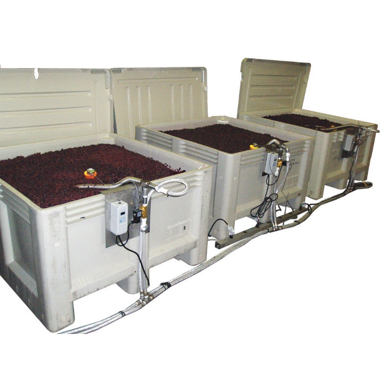 The Temperature Tamer hangs from the side of a bin or tank and has a built-in temperature controller that monitors the temperature and controls a solenoid valve, allowing coolant or heated water to enter a snake, plate or jacket to maintain your ideal temperature. Theoretically you could be maintaining the temperature of a red wine ferment at 77F in one tank while you cold stabilized a white wine at 30F in the next.