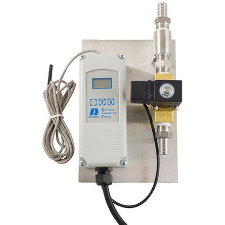 The built-in Ranco controller allows for heating or cooling, has a temperature range of -30 to 220F, and will maintain the temperature in a ferment or tank within one degree of your set point. The controller opens and closes the built in electronic solenoid valve to start or stop the flow of coolant.