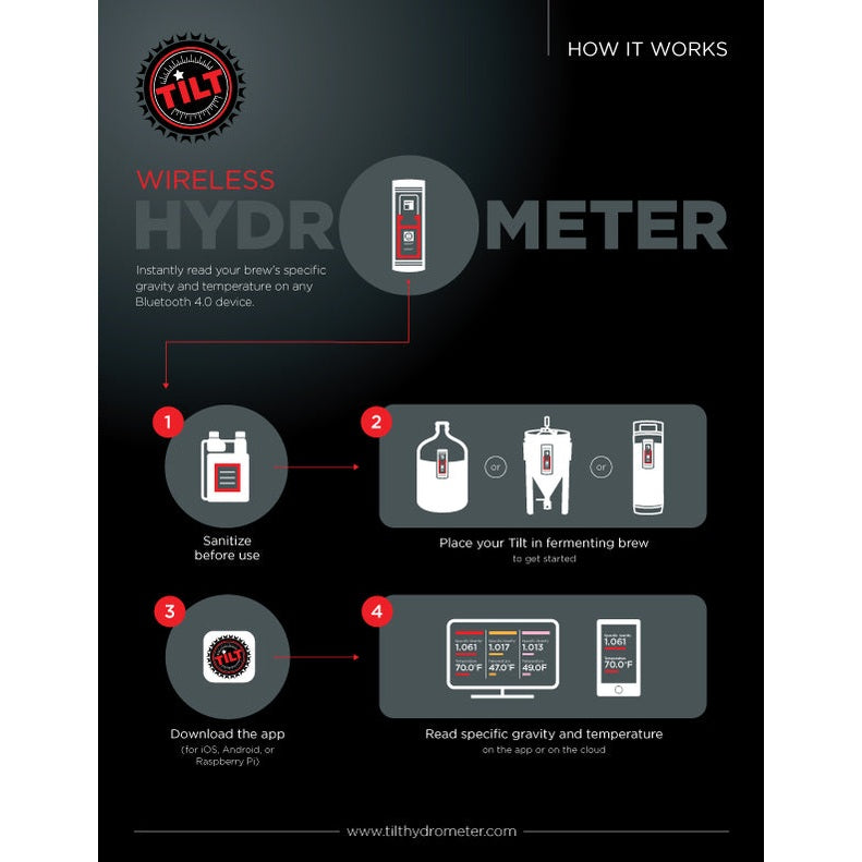 Designed for homebrewing, the Tilt hydrometer lets you instantly read your brew's specific gravity and temperature on your compatible Apple iPhone/iPad or Android smartphone/tablet or Tilt Pi. Most Bluetooth 4.0+ devices will work with the Tilt. You can then optionally log data to the cloud using their free Google Sheets template or other 3rd party cloud platforms.