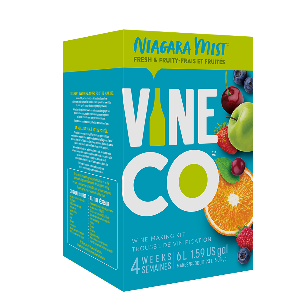 The VineCo Niagara Mist lineup offers a crisp, easy-drinking alternative to more traditional winemaking kits. These fruit-forward wine kits are all about capturing the refreshing essence of juicy ripe fruit. Light and crisp and offered in a full assortment of reds, whites, and rosés. Niagara Mist wines are easily enjoyed on their own, but also work well as the base for punches or wine spritzers.