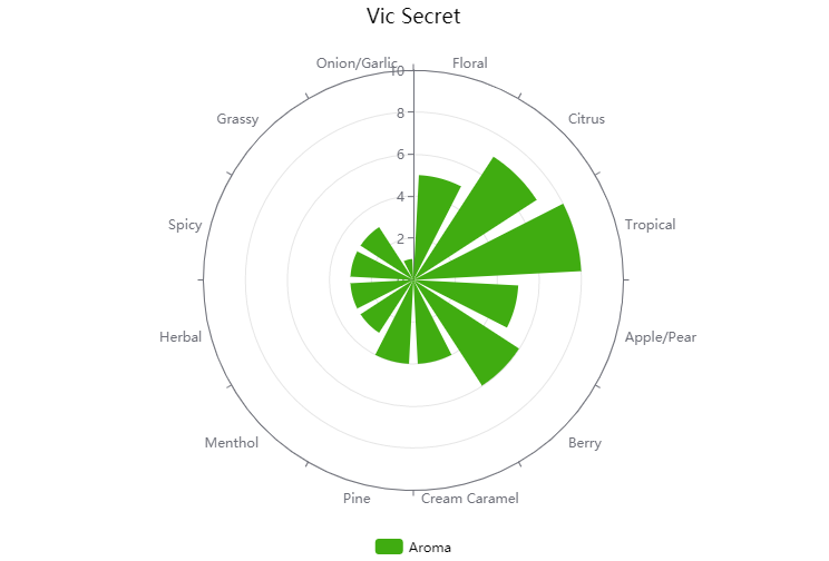 Vic Secret is an Australian hop known for its bright tropical character of pineapple, pine, and passionfruit. Similar to Galaxy but with a lighter profile. Highly recommended as a whirlpool or dry hop addition where the tropical notes will really shine. Displays a more earthy character when added late in the boil.