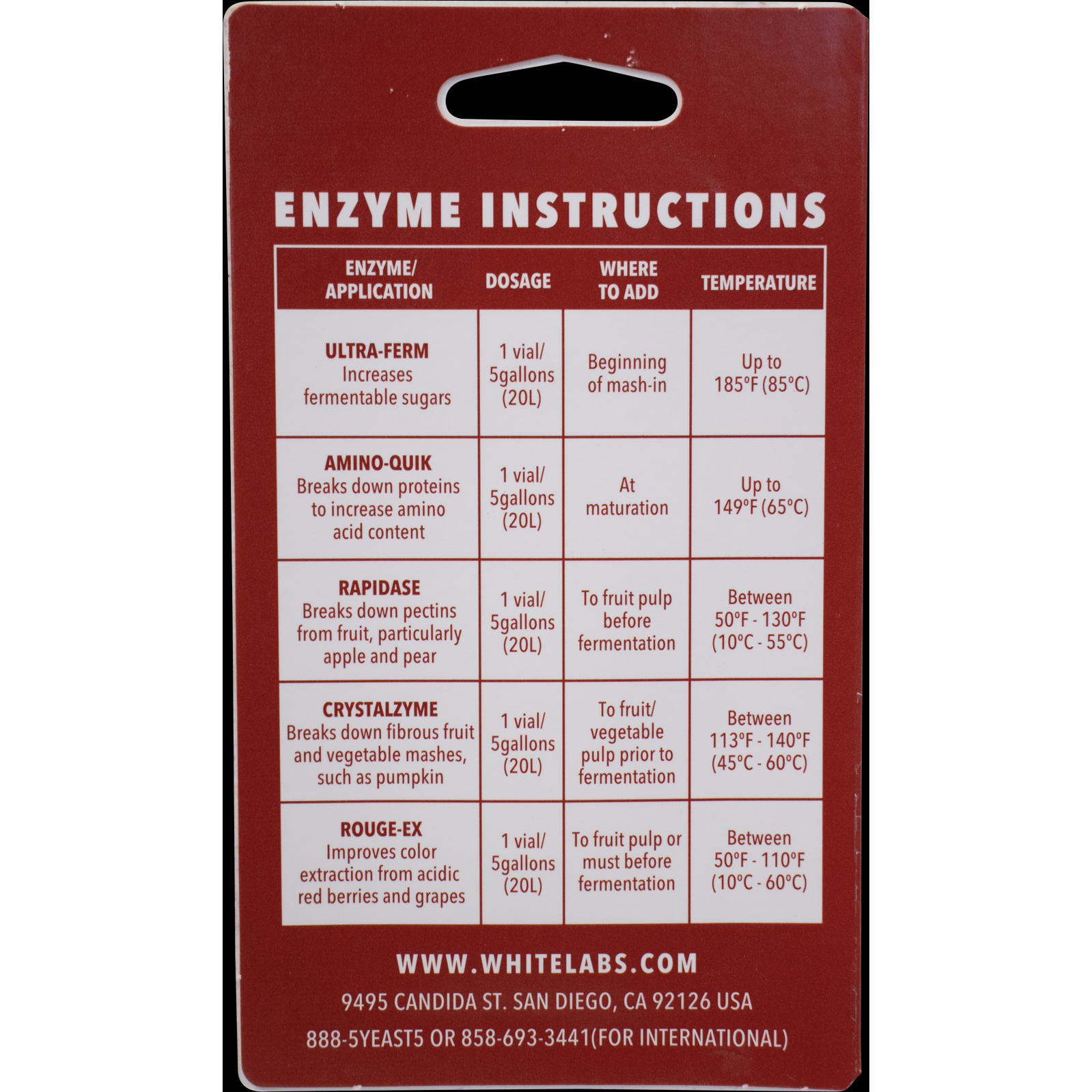 Add at the beginning of the mash-in. Ultra-Ferm optimal pH is between 3.5 and 5.5. Temperature should not exceed 140°F. Amyloglucosidase activity is completely destroyed when the wort is held at 185°F for 10 minutes.