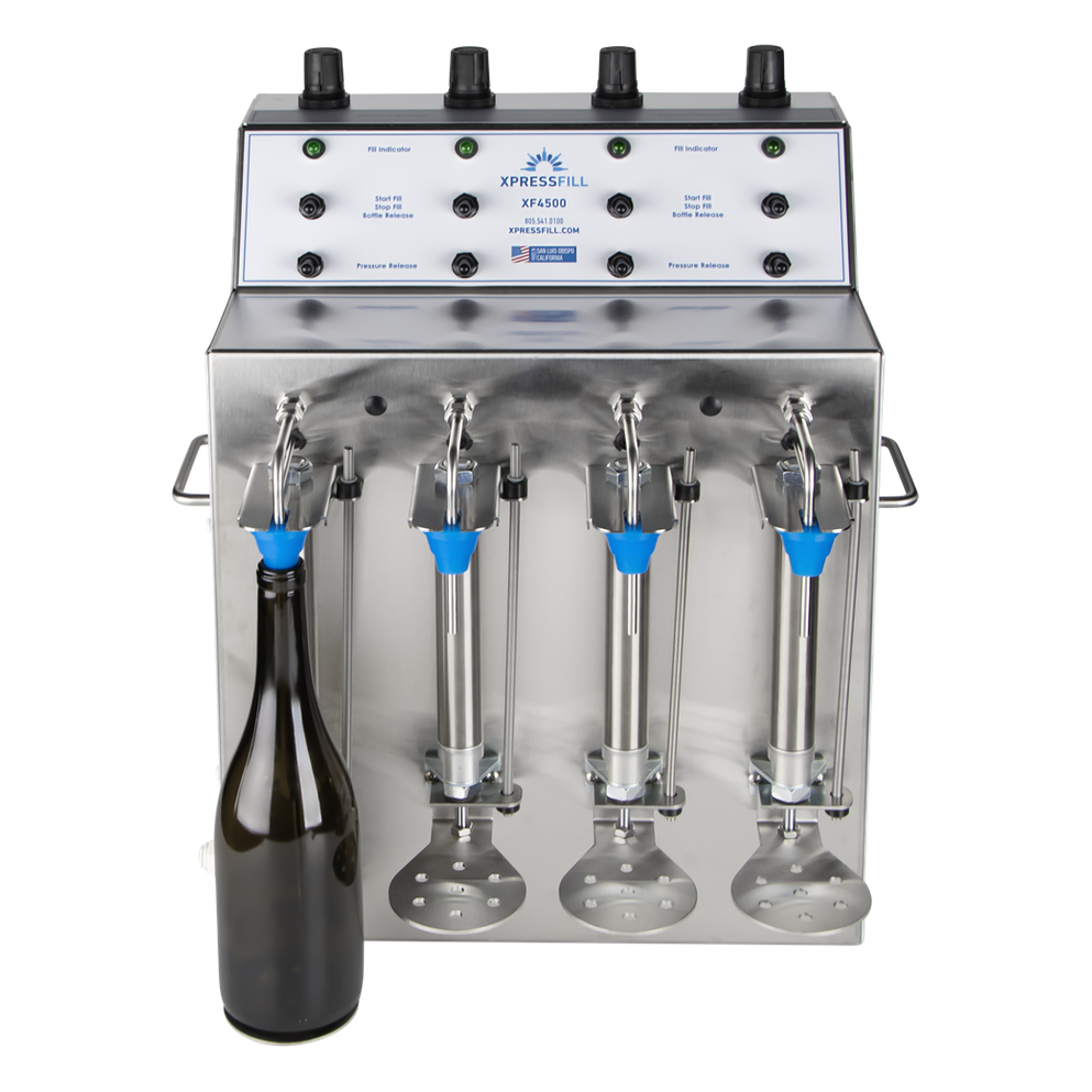 The Carbonated Beverage Filler is also suitable for filling Charmat-style sparkling wines, at a maximum operating pressure of 60 psi. The XF4500 requires that you also have an air compressor, which is used to hold the bottle rest in place, a canister of CO2, to pressurize and carbonate your tank or keg, and a pressurized container, to allow your product to flow from high to low pressure, through the machine.